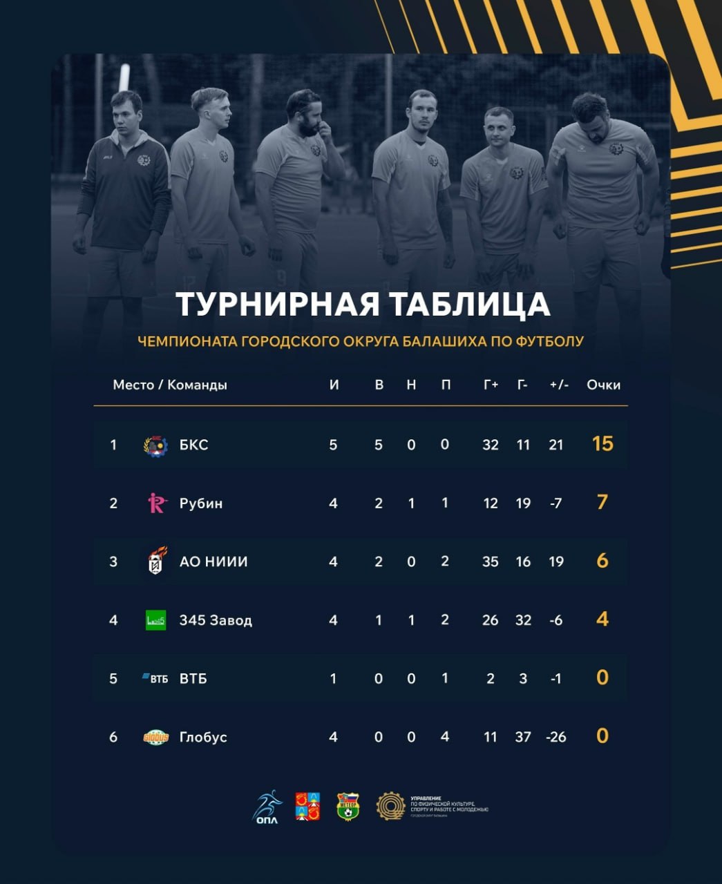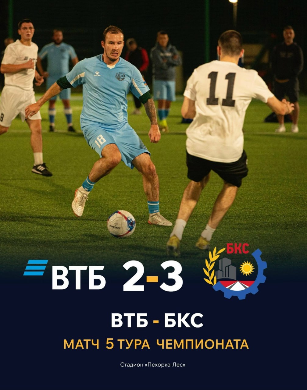 Вчера на стадионе «Пехорка-Лес» наша команда одержала волевую победу над ВТБ со счётом 3:2 в матче 5-го тура Чемпионата г.о. Балашиха! Эта победа имеет огромное значение и укрепляет позиции ФК БКС в турнирной таблице!